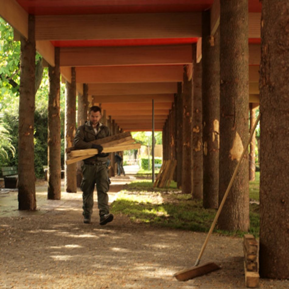 Die Konstruktion ist einfach. Der Pavillon funktioniert wie ein Tisch: Die Baumstämme entsprechen – bleibt man bei diesem Bild – den Tischbeinen. Diese sind an der Oberseite mit Schlitzen versehen, in denen eine Struktur aus Buchenholzträgern aufliegt. Diese tragen die rot lasierten Schaltafeln. Alle Materialen werden nicht einmalig eingesetzt, sondern finden nach ihrem Einsatz während der Architekturwoche durchwegs weitere Verarbeitung oder Verwendung.