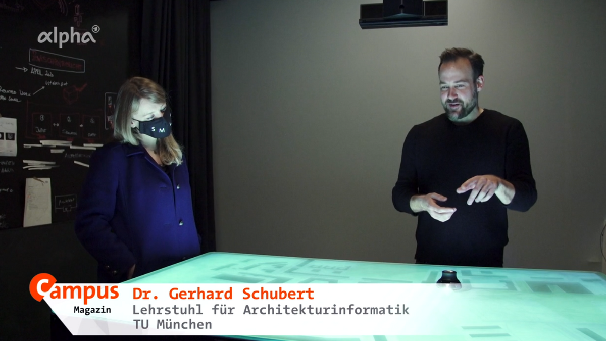 Unter anderem präsentiert Dr. Gerhard Schubert vom Lehrstuhl für Architekturinformatik in der Sendung den "digitalen Planungstisch", der im Rahmen des interdisziplinären Forschungsprojektes "CDP | Collaborative Design Plattform" entwickelt wurde.