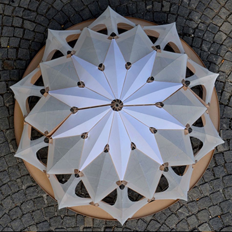 Der Ansatz ist, die Kinematik in einem Scherensystem zu nutzen, um eine Membran-Fassade vorzuspannen. Dies wurde durch die Integration eines Biegeelements, welches die Bewegung der Schere in einen Biegebogen übersetzt, erreicht. Ein Rotationsmechanismus, bei dem eine rautenförmige Struktur sich vom Bogen zur Kuppel wandelt, bildet so einen seeigel-förmigen Pavillon.