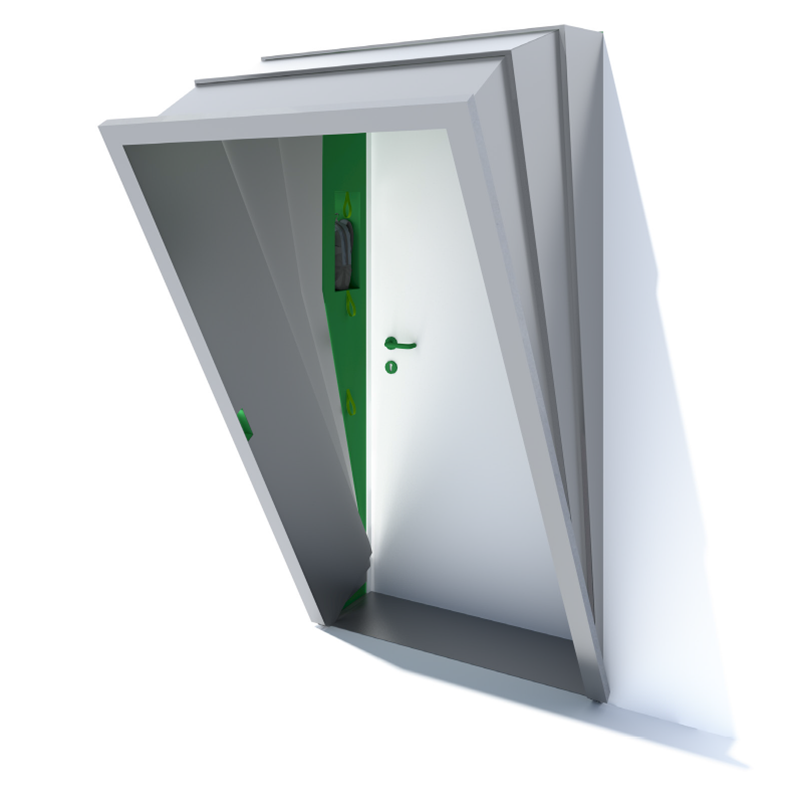 Die Erdbebenschutztür kann das verhindern und stattdessen: warnen – schützen – retten. Sie ist mit lokalen Frühwarnsystemen verbunden und verschafft kostbare Sekunden um in Sicherheit zu gelangen. Die ausklappbaren Zargenelemente erweitern den, durch den Türsturz ohnehin schon bestehenden Schutzraum. Alles, was für eine sichere Evakuierung notwendig ist, wird sichtbar.