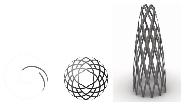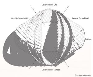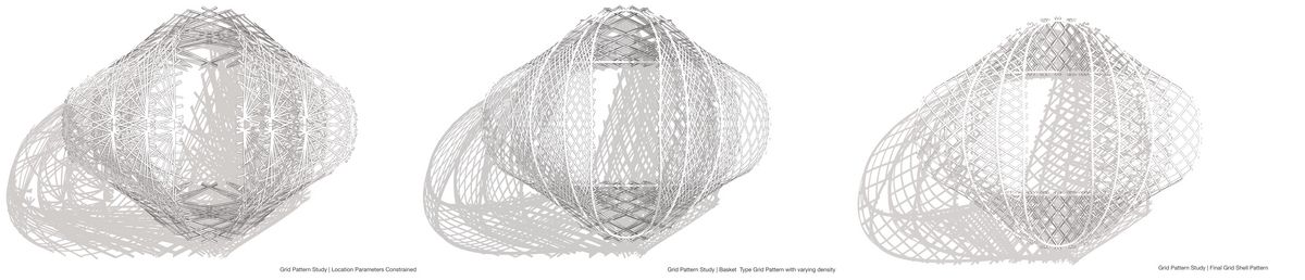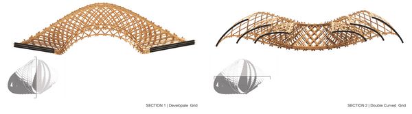 The gridshell was modeled by defining a number of points along the edges of the initial surface. The pattern developed by selecting parameters for the spacing, lead, and pattern of the elements. The curve is computated by following the shortest distance between the edge points on the surface, creating intersections, which can be marked out on flattened identified bamboo elements. The final gridshell is a regular pattern with square and triangular units in which the triangular units act as bracing elements. Edge profiles are bundled and follow the edge until the wing transitions from a double curve grid to a developable grid and are anchored into the ground.