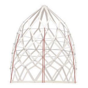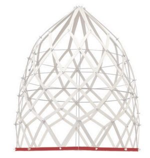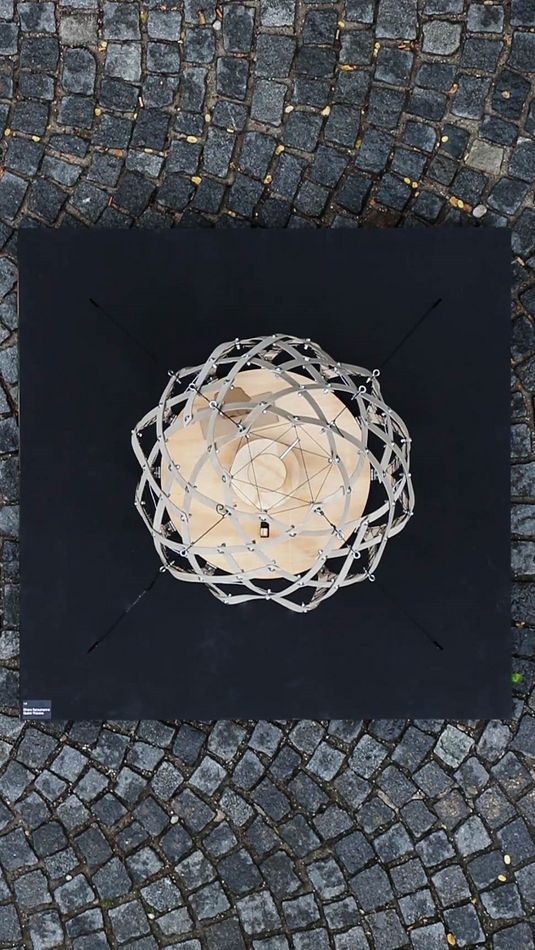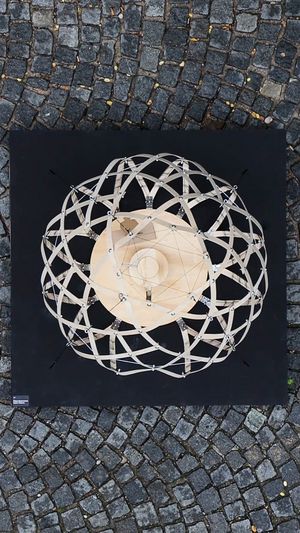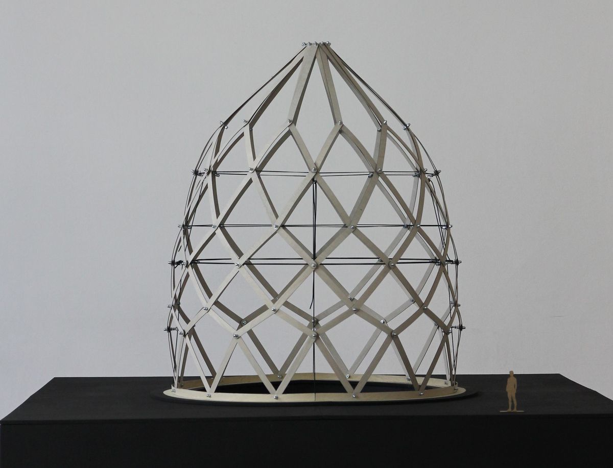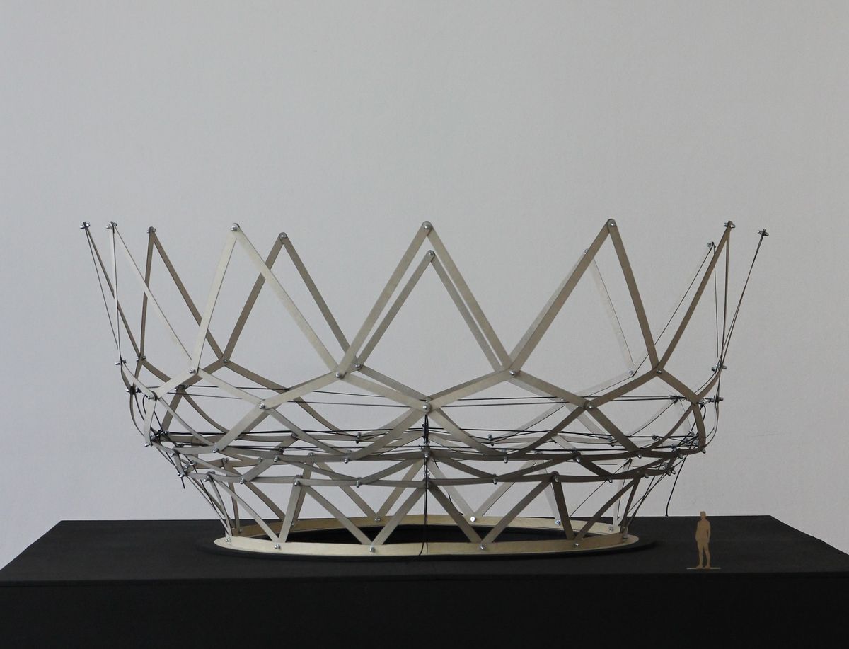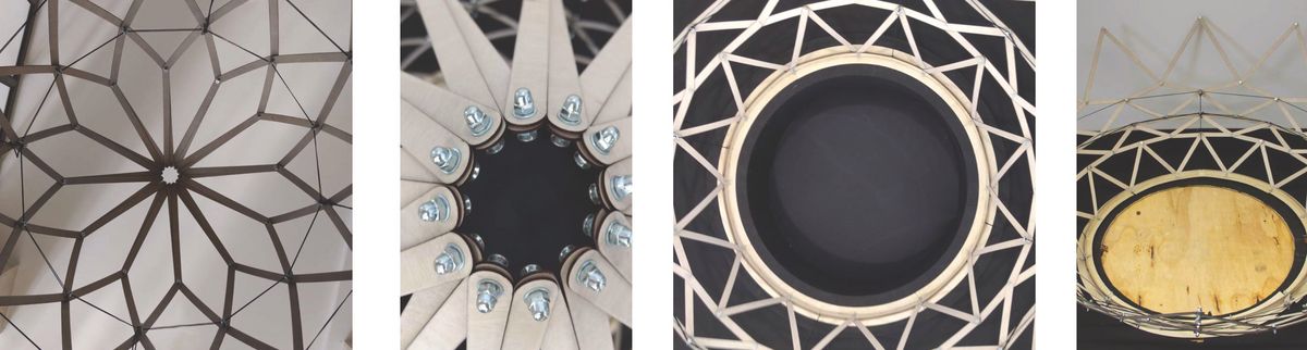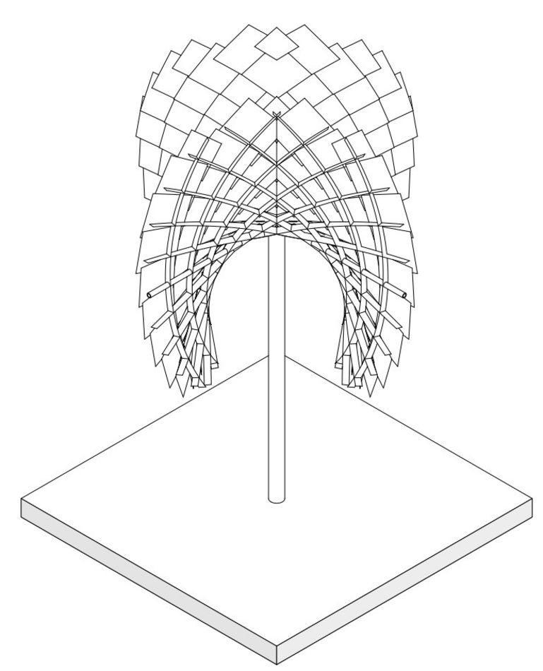 The final structure has been designed, so that from a close pine-cone shape could have been widly opened. The goal was to define a dramatically openable structure that could be able to retract. To reach this goal the angle between the scissors is the keypoint. The model has been realized with lamella in plywood of 1,5 mm, material that has a similar resistance in both main directions of the fibres. Material and thickness contibutes to give to the structure its elasticity, while mantain the shape and the resistance.