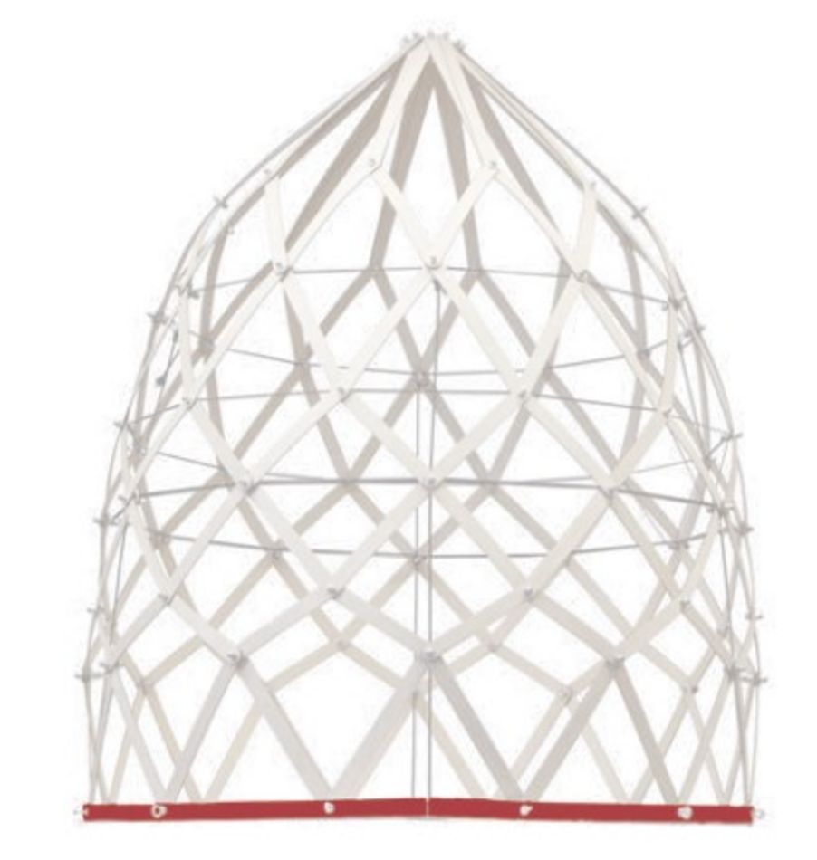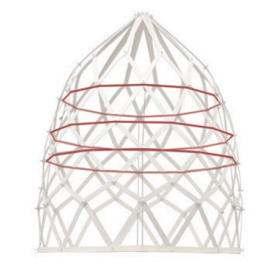 As seen in the previous models of such elastic structures, the bottom circumference is able to define its position and not be moved. For this reason, the first half-bars have conceived to remain one continuos curvilinear beam, which like a drum link the dome to the perimeter of the below construction.