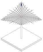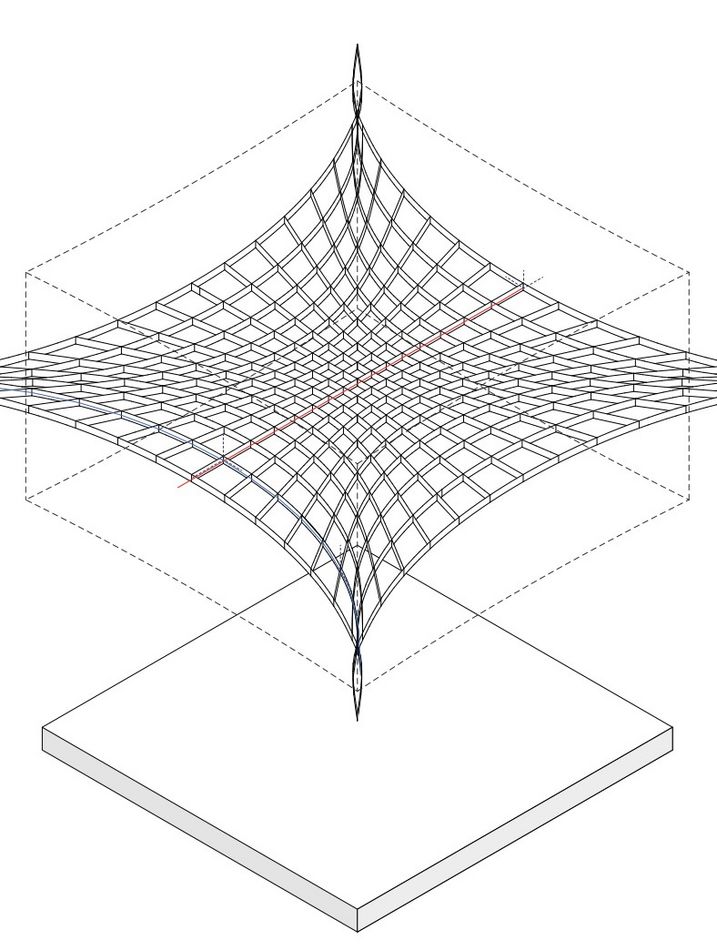 3. When the grid structure is released, all beams will search for a state of equilibrium in which the least amount of internal energy is produced. The enneper folds out and takes nearly the shape of a hyperbolic paraboloid. (Note: All beams elements experience mainly torsion only in this state). This hyperbolic output is very steep, requiring too much height. The amount of material per covered square meter should also be better.