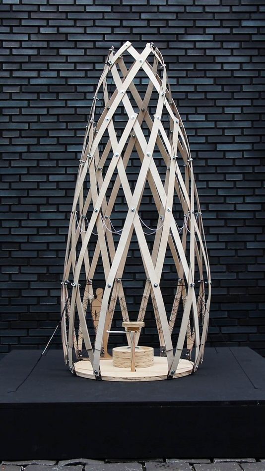 The BLOOMING FLOWER is a pavilion made of straight, wooden lamellas. From the inside it is possible to trigger a mechanism which changes the pavilion's shape. In this way, a larger space is obtained. Turning the handle brings the lamellas down and because of the elasticity of the wood, the lamellas bend out and get the desired shape.