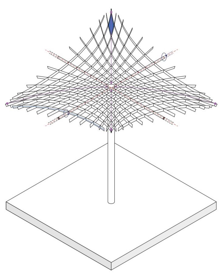 The elastic kinetic mechanism is based on the elastic behaviour of rectangular profiled, pre-curved beams and a counter-forcing cable pulling system. The beam profiles used in the structural model has 6 layers of cross-laminated veneer. Only 2 of the beams are the grains directed in the longitudinal direction, as in a regular solid wooden beam. Orienting the majority of veneer layers upright, gives each beam more flexibility and it holds the prebent curvature better. The pre-curving serves as a pre-stressing of the grid system, while the beams always will search back to their initially curved and untwisted shape, resulting in a more or less flat configuration. To put the system in action, the tension from the pre-bent beams, needs a counterforce. It is solved by a synchronised cable pulling system, pulling each from the grid‘s 4 corner points towards the centre, then down through the column.