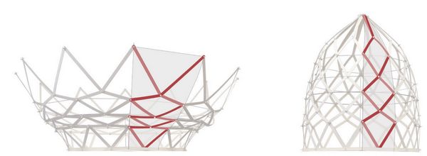 There are different kinds of wires. Elastic wires located horizontally have the main function of creating tension to brings the structure back to its closed state to the retracted position. The vertical strings function only to start the hidden mechanism, by pulling down the structure in four different points.
