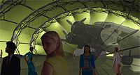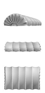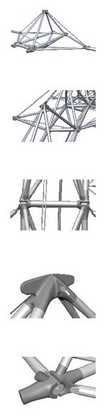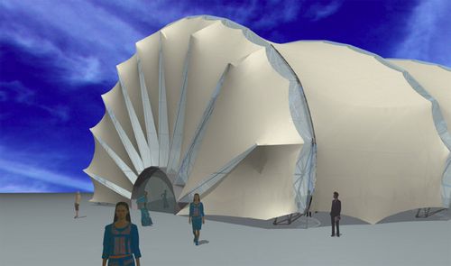 Der Entwurf eines eigenen Systems wurde vorbereitet durch die Zusammenstellung von Nutzungsbedingungen und statischen sowie konstruktiven Anforderungen an das System. Verschiedene Aufrichtvorgänge wurden entwickelt und verglichen. Die Wahl fiel schließlich auf Korbbögen aus einem räumlichen Stabwerk, zwischen denen eine PVC-beschichtete Polyestermembran gespannt wird. Ein hoher Detaillierungsgrad wurde erreicht. Sämtliche starren und beweglichen Knotenpunkte sind dargestellt. Die Form der Membran entwickelten die Bearbeiter mit numerischen Formfindung-sprogrammen.