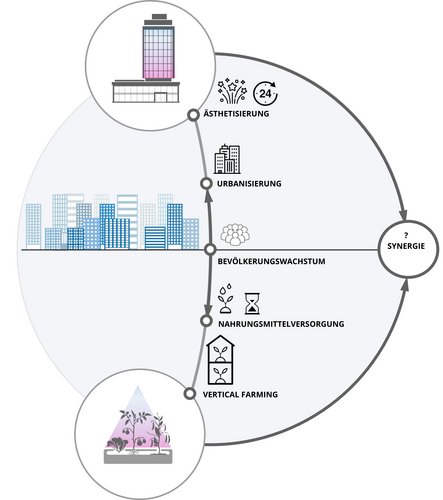 Two of the global challenges which the city of the future will face are the consume of (artificial) light and the food supply. Those two issues have something in common: population growth and urbanization. Projections show that human population is likely to rise to 9,31 billion by 2050. The rapid population growth challenges the global food supply. The two factors - population growth and arable land per capita - are directly related to each other. The possibilities for extending the agricultural areas are limited and innovative solutions for integrating agricultural solutions in urban areas are gaining importance. In the same time light installations and illumination in urban spaces are central aspects of the city marketing and play an important role for increasing the attractiveness of public spaces. Modeling the visual appearance of building facades using artificial light is part of this rising trend. There is a causal relation between the aesthetic appearance of the city and its economic growth and it is expected that this relationship will gain in importance in the future. Modeling the visual appearance of building facades through illumination can be also used for another purpose: cultivation of crop plants supported by artificial light (vertical farming). The subject of the project Agricultural Lighting Façade is designing a building facade able to perform two specific tasks: aesthetic illumination and cultivation of crop plants in controllable climatic environment. Bringing together greenhouse technology, facade technology and lighting design we explore the possibilities for achieving synergies between different applications and uses. An innovative solution enabling the simultaneous coexistence of vertical farming and lighting façade will leverage synergies by creating local, sustainable production of fresh vegetables and contributing to the aestheticization of urban areas in the same time.