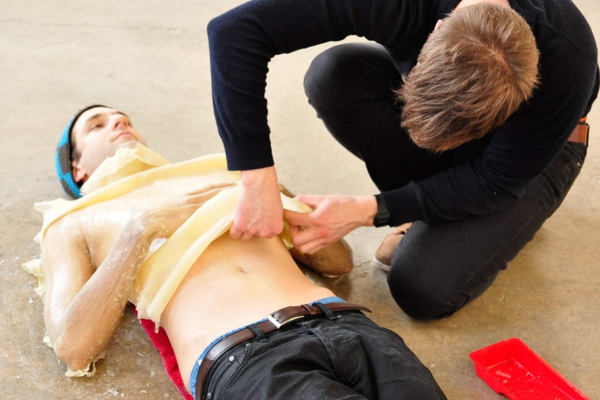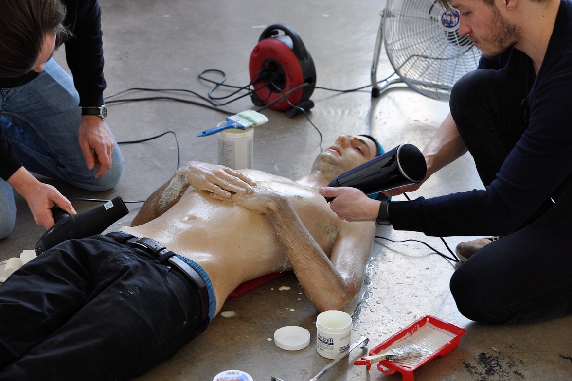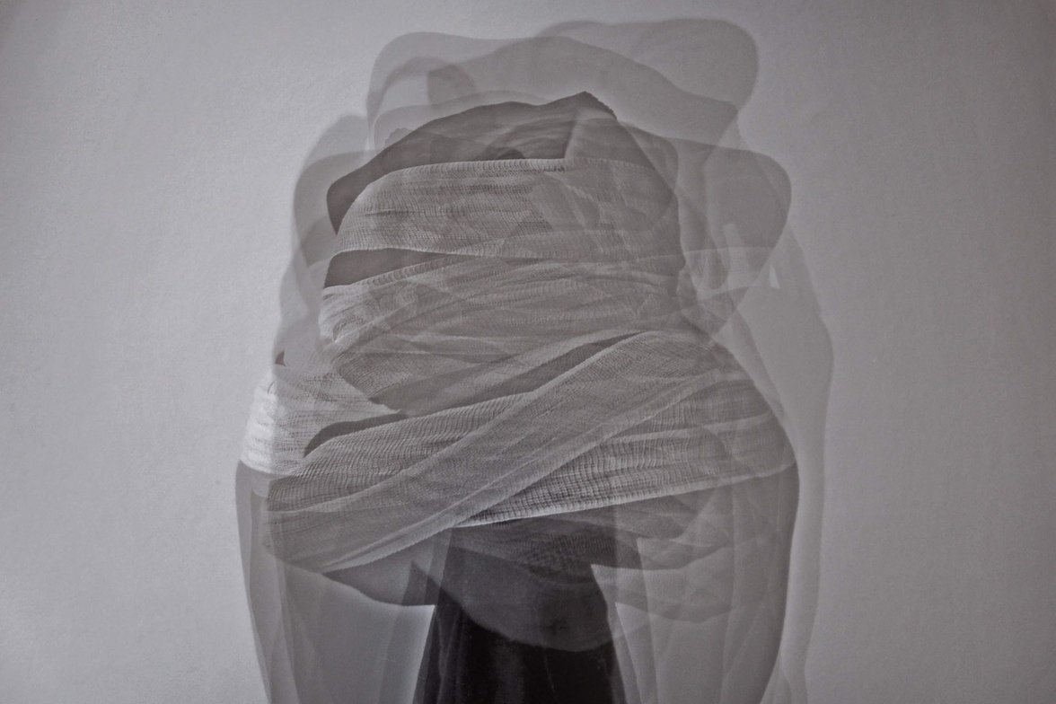 Für Josua Gansel und Judit Kovats findet Erbauung im Rückzug statt. Ihre Fotoarbeit „Die Traumtänzer“ überlagert Dokumentationsfotos eines Prozesses, in dem sich ein Mensch verhüllt, während er sich um seine eigene Achse dreht. Das daraus entstandene Bild legt in seiner Loslösung vom Abbildhaften Schichten psychologischer Dimension frei.
