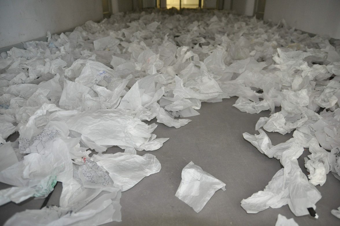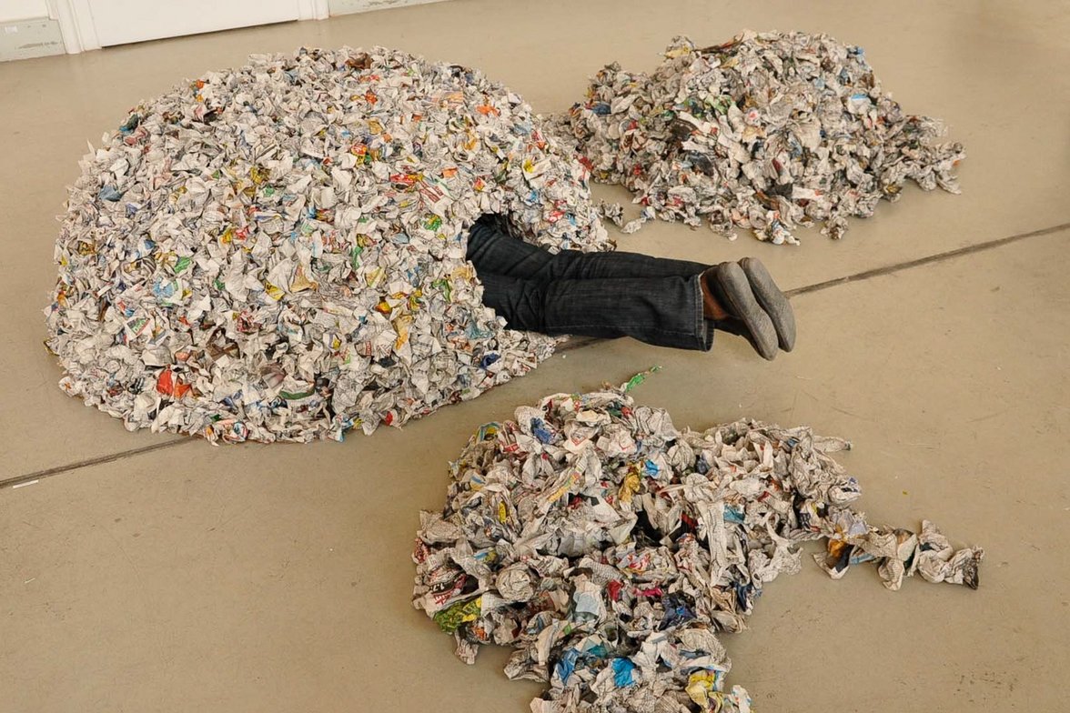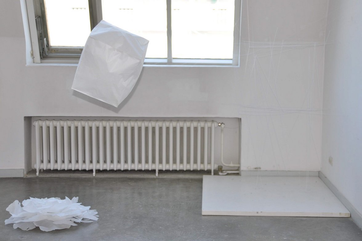 Veronika Lachner knüpft mit ihrer Skulptur an ihre Kindheitserinnerungen an: das Moment der Geborgenheit einer selbst gebauten Höhle unter dem Küchentisch klingt in der fragilen Raumhülle nach, die von einem Tischtuch aufgespannt wird. Ihren eigentlichen Reiz entfaltet die Arbeit allerdings erst, wenn man erkennt, dass die scheinbare Tragkonstruktion aus Tisch und Stuhl unter der Decke gar nicht mehr vorhanden ist.