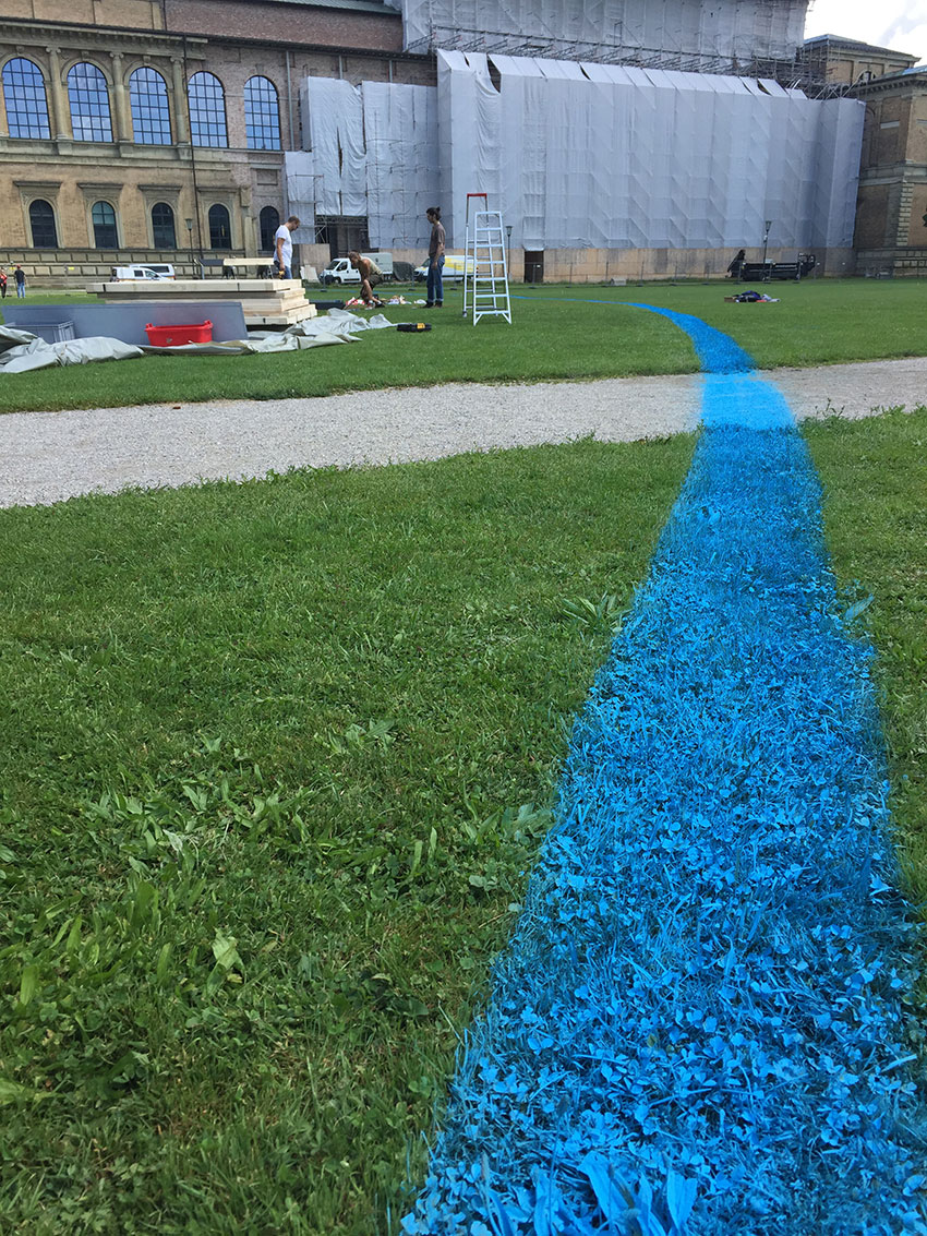 Wie ein falscher Schatten wirkt der Schwänzeltanz der Bienen auf dem Vorplatz zum Botanischen Garten. In Weihenstephan wird über die Kommunikation der Bienen geforscht. Die Kreidezeichnung lädt das Publikum ein, diesen Tanz nachzuschreiten am besten - auch wie die Bienen - mit möglichst viel Bewegung im Hinterteil...