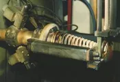 Am Lehrstuhl wurde vor über 25 Jahren mit dem Aufbau eines Hochgeschwindigkeitsbeschleunigers zur Simulation von Mikrometeoroiden und Space Debris begonnen. Dieser wird bis heute vielfach verbessert und mit neuen Komponenten aufgerüstet und ergänzt. Mit der plasmadynamischen Beschleunigeranlage können Teilchen im Durchmesserbereich von etwa 30 µm bis 100 µm auf Geschwindigkeiten von etwas mehr als 12 km/s beschleunigt werden. Als Teilchen werden Glaskugeln verwendet, die durch einen sehr schnellen Plasmajet aerodynamisch beschleunigt werden. Der Plasmajet selbst wird durch Ionisation von eingespritztem He-Gas in einer koaxialen Elektrodenanordnung (Durchmesser: 33 mm; Länge: 160 mm) durch die Stoßstromentladung einer Kondensatorbank (Kapazität: 352 µF) erzeugt und beschleunigt. Bei Ladespannungen der Kondensatorbank bis zu 16 kV treten Spitzenströme bis zu 450 kA auf. Am Ende der koaxialen Elektrodenanordnung wird das Plasma in einer eigenerregten konischen Spule (Kompressionsspule) verdichtet. Der so gebündelte Plasmajet tritt dann in Wechselwirkung mit den ruhenden Mikroteilchen und beschleunigt diese. Die obige Abbildung zeigt die Elektodenanordnung mit der Kompressionsspule.