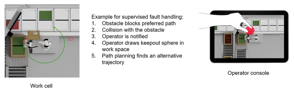 Abhängig davon, ob der Fehler bei der Objekterkennung, dem Zugreifen, dem Transport oder dem Ablegen des Objekts passiert, wird dem Operator eine auf den Fehlerfall zugeschnittene semi-autonome App angezeigt, in der er den zum Lösen des Fehlers essentiellen Input geben kann. Die untenstehende Abbildung zeigt einen exemplarischen Anwendungsfall: Wird ein Hindernis im Arbeitsraum des Roboters nicht autonom erkannt, kann der Operator eine sogenannte Keepout-Sphere in den Arbeitsraum zeichnen und so die Bahnplanung zum Umfahren des Hindernisses zwingen.