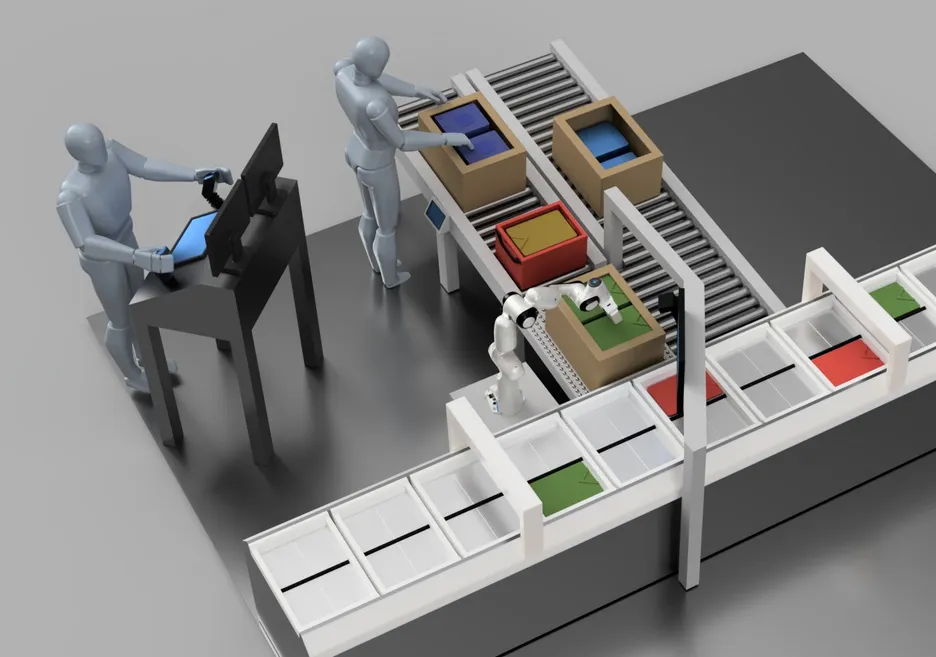 FIEGE ist einer der größten Logistikdienstleister in Europa und bietet für seine Kunden individuelle Logistiklösungen. Am Standort in Mönchengladbach übernimmt FIEGE die Logistikabfertigung für einen Modekunden. Neben Kleidungsstücken werden auch weitere Artikel vollautomatisch gelagert und sortiert. Einzelne Prozesse wie das Umpacken von Kleidungsstücken zwischen Kartons, Dropboxen und dem oben abgebildeten Split-Tray Sorter werden aktuell vollständig manuell per Menschenhand durchgeführt. Dieses Projekt zielt darauf, diese bestehenden manuellen Prozesse durch den Einsatz von robotischen Greifarmen zu unterstützen. Das Forschungsfeld des SAINT-Projekts konzentriert sich dabei auf das Umpacken von Kleidung aus Kartons auf den Split-Tray Sorter. Gemeinsames Ziel ist hier eine produktive Anwendung der Robotik mit verhältnismäßig wenigen Anpassungen an der bestehende Anlage.