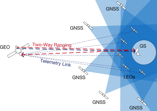 GEO satellites are orbiting above GNSS constellations and therefore are positioned by ranging measurements from ground. This usually leads to accuracies in the range of 1-2 km.