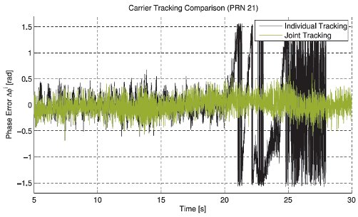 Precise positioning methods require the simultaneous reliable tracking of the carrier phase on several frequencies and from several satellites. Phase locked loops (PLL) perform independent tracking of the carrier phase on every satellite. They loose lock when the corresponding satellite suffers from shadowing or strong ionospheric scintillations. Joint tracking algorithms make use of the spatial and spectral correlation of the received signals. The following benefits have been confirmed