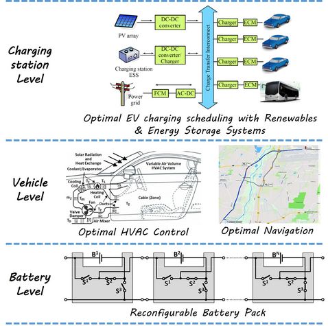 Vehicle Level: On the vehicle layer, optimally scheduling different vehicle sub-systems such as the Heating, Ventilation and Air Conditioning (HVAC), and motor control, or how a route is planned, also impacts the load on the battery pack. These scheduling decisions impact deadline requirements on reaching a destination and also the usable energy and life of the battery in the vehicle. The second talk will focus on these issues.