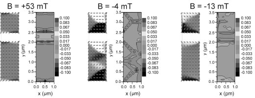 Die experimentell ermittelten Domänenmuster, die wir mit lokalen Sonden (Hall-Nanomagnetometer, Magnet-Kraft-Mikroskop, magneto-optische Kerr-Mikroskopie) an ferromagnetischen Mikro- und Nanomagneten messen, werden mit theoretischen Vorhersagen verglichen. Diese werden errechnet auf der Grundlage der Landau-Lifshitz-Gilbert-Gleichung (LLG), die die Bewegungsgleichung der Magnetisierung darstellt. Zur Lösung der LLG verwenden wir das kommerziell erhältliche Programm MicroMagus. Damit führen wir mikromagnetische Simulationen zu den Domänenmustern, zu den Hysterese-Eigenschaften und zu den Streufeld-Verteilungen durch.