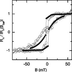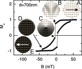 Im Bild oben ist die berechnete Hysterese einer Permalloy-Nanoscheibe gezeigt. Mit Hilfe der Streufeld-Messung unter Verwendung eines nanostrukturierten Hall-Sensors haben wir das Ummagnetisierungsverhalten auch experimentell studiert. Tatsächlich spiegelt die Hall-Kurve die Hysterese der ferromagnetischen Nanostruktur sehr detailliert wider. Es ist deshalb zu vermuten, daß die hergestellte Nanoscheibe über den sogenannten Vortex-Zustand (Zustand C im Bild oben) ummagnetisiert. Ein derartiger Magnetisierungszustand eignet sich als magnetischer Speicher, da im Umlaufsinn der mikroskopischen magnetischen Momente zwischen linksdrehend und rechtsdrehend unterschieden werden kann. Dies stellt zwei unterschiedliche Speicherzustände dar. Gleichzeitig ist das Streufeld nach außen sehr gering, wie die durchgeführte Hall-Messung zeigt.
