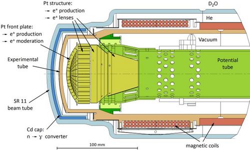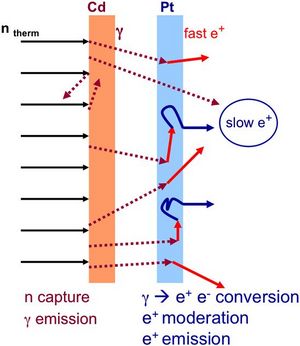 The absorption of the prompt high-energy γ-radiation (up to 9MeV) generates positrons by pair production with a maximum intensity at a positron energy of about 800 keV. After moderation in platinum thermalized positrons can diffuse to the surface and are emitted into the vacuum (see figure 1).