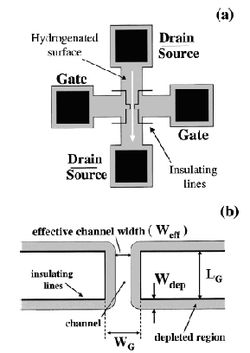 Hydrogen-terminated surfaces of single-crystalline diamond have generated a lot of interest due to their surprising electronic properties. Whereas “normal“ diamond with oxygen termination is an almost perfect insulator, hydrogen termination of diamond crystals by a simple plasma process gives rise to a negative electron affinity, meaning that electrons in the diamond conduction band have a higher energy than electrons in vacuum. One important consequence of this fact is that hydrogen-terminated diamond samples in contact with air spontaneously form a two-dimensional hole gas via electron transfer from the diamond crystal to adsorbed hydronium (H3O+) molecules at the surface. This hole gas is located directly at the diamond surface and exhibits a metallic character with hole densities up to 1014 cm-2. Surface electronic devices can be defined via a simple local oxidation, which creates highly resistive barriers between the metallic hydrogenated regions. As an example, the figure below shows an in-plane-gate transistor (IPGT), which was obtained by electron beam lithography. Such transistors are particularly interesting for diamond sensor devices.