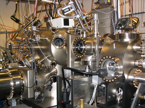 Molecular beam epitaxy (MBE) allows the control of semiconductor nanostructures with atomic precision. We concentrate in our group on GaAs- and Si-based materials systems and fabricate high quality heterostructures, quantum wells, and superlattices which are the basis for the realisation of lateral nanostructures like e.g. single electron transistors or quantum rings. Such devices allow for the control of single charges and spins. A special MBE technique, namely cleaved- and double cleaved edge overgrowth is used for the realisation of novel quantum wire and quantum dot devices which are test systems for future quantum information technology. We also study self-assembly and self-ordering of semiconductor quantum dots in lattice mismatched systems like Si/Ge and InAs/GaAs. Ordering of such quantum dots is achieved for example by combining cleaved edge overgrowth and self assembly where the cleavage plane provides an atomically precise template. Our high purity MBE machine in which also cleaved edge overgrowth is possible is shown in the figure.