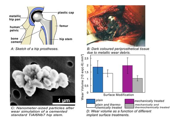 There exist different aspects how nanometer-sized structures can control the mechanical properties and thereby the biocompatibility of medical implant materials. The orthopaedic surgery is often confronted with an early revision of hip prostheses due to the phenomenon of aspetic loosenig. This phenomenon occurs preferentially, but not exclusively, on Ti based hip stems fixed in the femoral bone by means of bone cement (fig. A). Thus, presently there exists a great insecurity about the application of distinct stem models. Several critical factors are considered to be responsible for the early failure of these hip prostheses. In particular nanometer-sized metallic wear debris generated in the frictionally loaded interface hip stem - cement may affect the cell response of the ambient tissue (fig. B). Main focus of the research project is the determination of significant factors favouring the generation of harmfull wear debris with the aim to avoid generation of such particles.