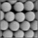 Scanning electron microscope image of a dried, 10-mm-diameter colloidosome composed of sintered polystyrene spheres (450nm radius). The holes between the particle are about 300nm and thus the colloidosomes can be used as sieves for different biophysical application.