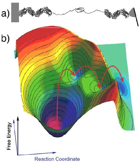 Proteins are wonderful examples of self-organized nano-machines. Proteins are peptide polymer chains built from an amino acid library containing 20 different members. One of the most fundamental and challenging problems in molecular biophysics is understanding how these polypeptide chains fold into complex 3 dimensional structures that can act as channels, enzymes and even motor proteins. We use single molecule mechanical methods to measure the forces directly that stabilize protein structures. Mechanical forces offer the unique possibility to study the energy landscapes of proteins along a well-defined reaction coordinate. From: