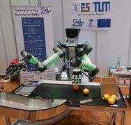 Robot TOMM that is able to sort oranges. The oranges are sorted by their quality. The robot feels the quality because bad ones are usually softer than good ones. The robot feels this with its hand that is equipped with the artificial skin - CellulARSkin. Another specialty in this demonstration is the fact that the robot is not preprogrammed for this task. With semantic reasoning it learned the task from high-level commands such as "pick the orange" "put it in a box". More details in the paper "Understanding the intention of human activities through semantic perception: observation, understanding and execution on a humanoid robot" by Karinne Ramirez-Amaro, Michael Beetz and Gordon Cheng.