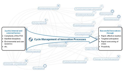 Cycles are described as recurring patterns – temporal and structural ones – which influence the factors on the innovation process internally and externally within the company. A cycle is characterized by its trigger, phases, duration and effect. Examples for cycles internally within the company are planning and development cycles, recurring processes (e.g. change processes) or changes within the organizational structure and team changes. The external cycles in the form of, for example, customer demand coverage, innovation cycles at the market or new product and production technologies, influence the innovation process. Within this innovation process, the different internal and external cycles underlie numerous, partly temporal entanglements and dependencies. Companies are facing the challenge to successfully act and react in a conflicting environment, which is highly impacted by internal and external cycles along the innovation process. The increasing global competition moreover requires companies to decrease the length of their innovation cycles, to lower the timespan for acquiring new innovations or to shorten the time to integrate novel technologies. In addition, the necessary coordination and communication effort increases, because the number of subject areas and qualified personal involved in the innovation process rises, especially if companies transform themselves from product providers to PSS providers. As a consequence, the successful management of cycles within innovation processes is becoming more and more important for the companies in order to successfully persist in the related market and to stay competitive. Therefore the cross-disciplinary goal of the CRC 768 is to gather and to analyze the dependencies of the several internal and external cycles in the innovation process of PSS and to develop methods, models and tools, which empower companies towards a cycle oriented design of the innovation process.